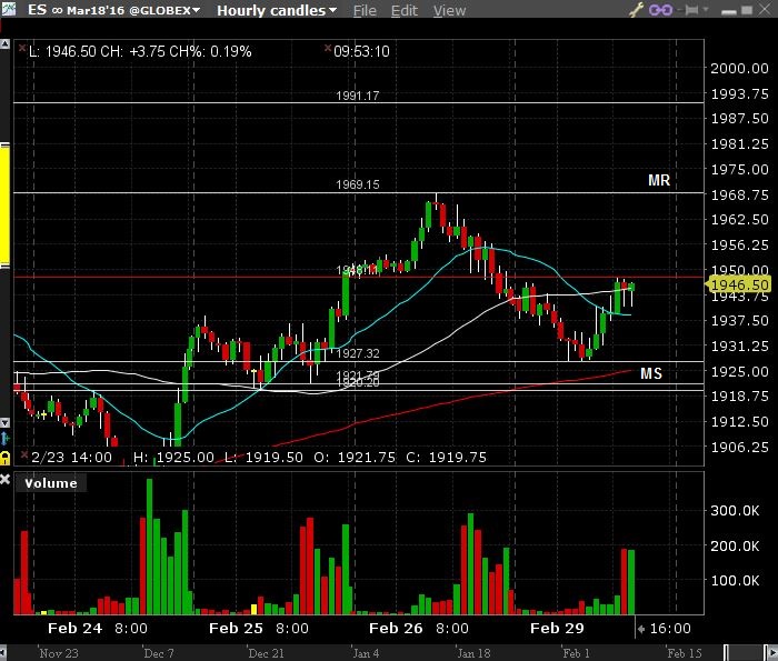 Overnight, the ES continued its move lower to finally find Support at the 1927 level before moving back up to where we are currently trading at the 1947 level, back above our key 1940 area on the Daily chart. Right now the market looks sideways from our 1969 high to our low of 1927. Currently I'm just sitting on my hands waiting to see which way this market is going to go...